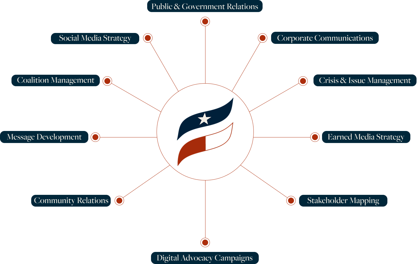 Backed by a deep network of policy, media, and community relationships across Texas, we deliver top-tier expertise when and where it matters most. Whether engaging stakeholders, managing reputation, or launching corporate advocacy campaigns, we help our clients earn attention, shape opinion, and build trust.